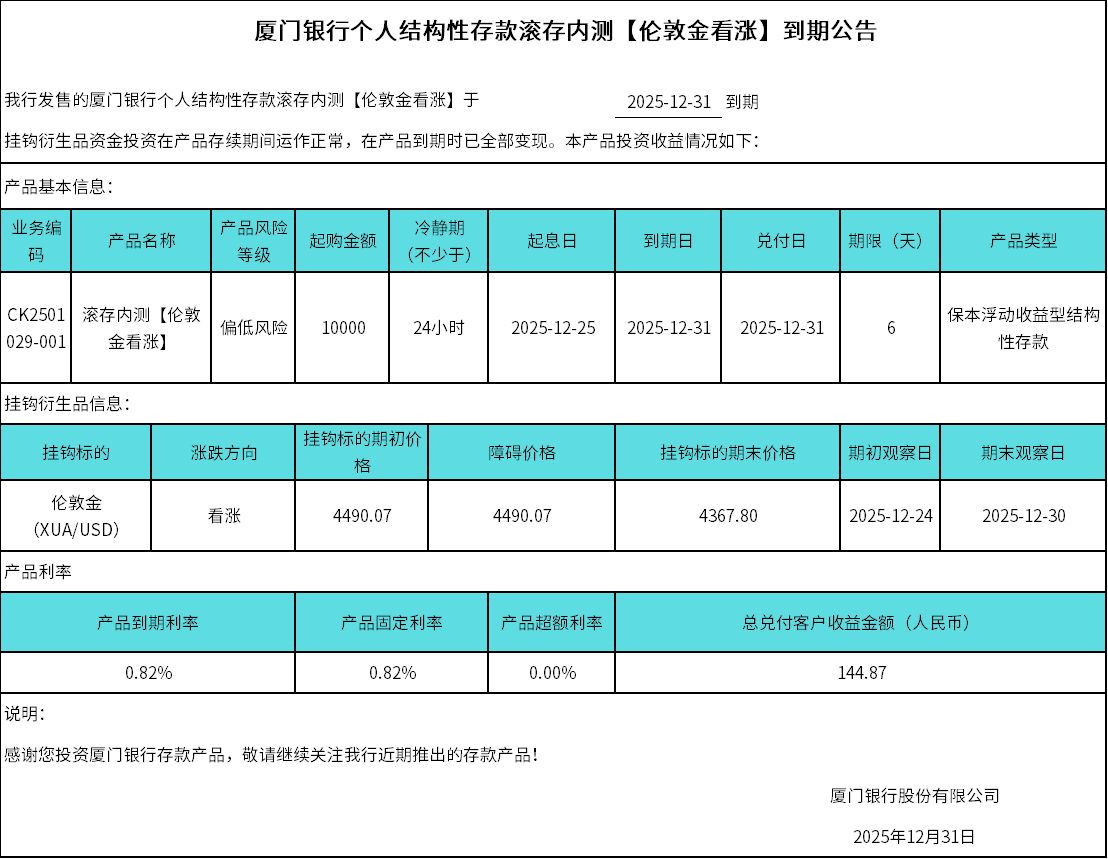 廈門銀行個人結(jié)構(gòu)性存款滾存內(nèi)測【倫敦金看漲】到期公告