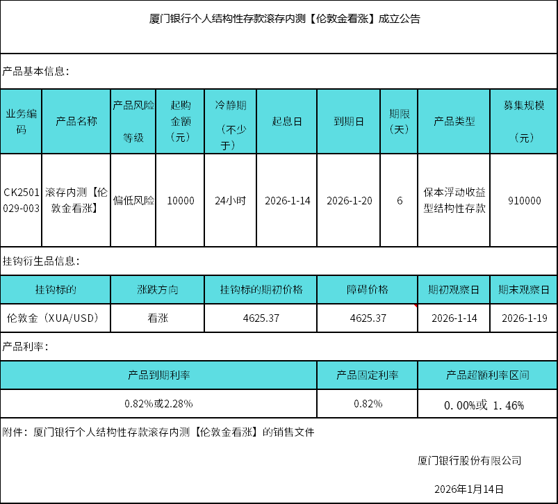 廈門銀行個人結(jié)構(gòu)性存款滾存內(nèi)測【倫敦金看漲】到期公告 日期:2026-01-14 16:08:50 廈門銀行個人結(jié)構(gòu)性存款二元觸發(fā)型029-003期掛鉤【倫敦金看漲】銷售文件.zip 上一篇 返回 下一篇