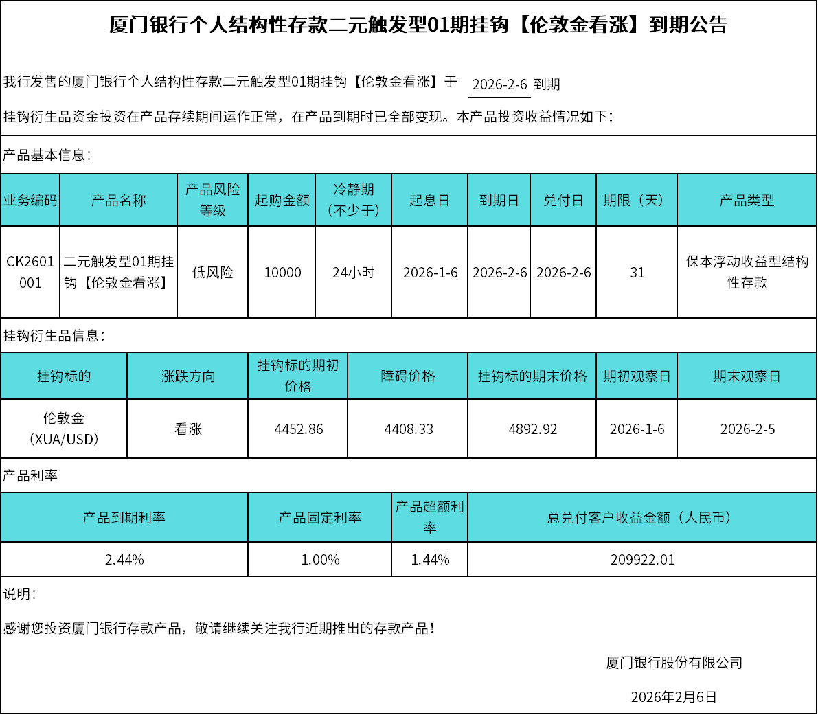 廈門(mén)銀行個(gè)人結(jié)構(gòu)性存款二元觸發(fā)型01期掛鉤【倫敦金看漲】到期公告