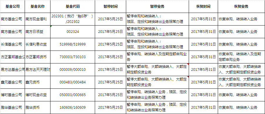 1、2017年5月25日至5月30日,根據各基金公司安排為保護基金份額持有人權益貨幣型基金業(yè)務將暫停,2017年5月31日,各項業(yè)務將恢復正常,屆時不再公告,最終以基金公司發(fā)布公告為準。