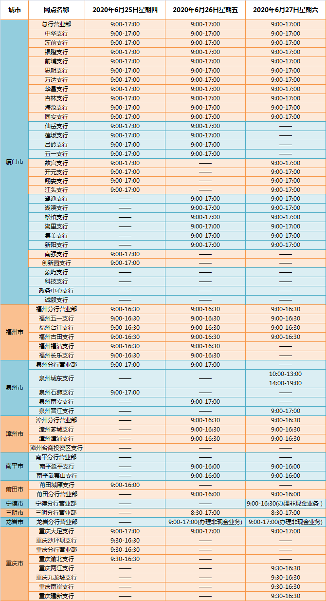 您好!根據(jù)國務院辦公廳有關通知安排,廈門銀行2020年端午節(jié)放假時間為2020年6月25日至27日,共3天。6月28日(星期日)正常營業(yè)?,F(xiàn)就2020年端午節(jié)放假期間營業(yè)網(wǎng)點安排事項通知如下: