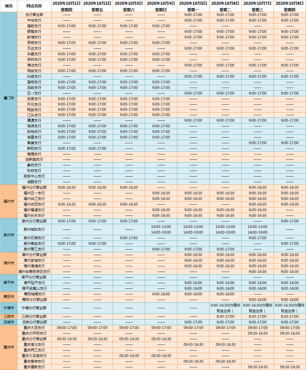 廈門銀行2020國(guó)慶中秋假期網(wǎng)點(diǎn)對(duì)外營(yíng)業(yè)時(shí)間通告