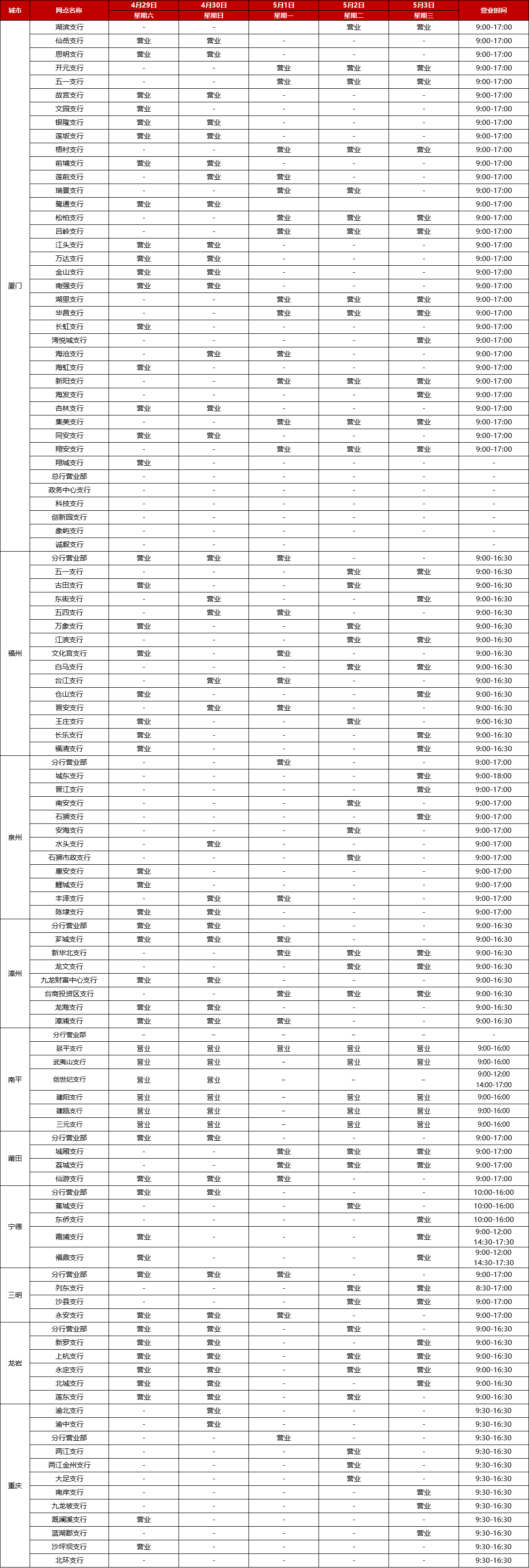 廈門銀行2023年勞動節(jié)假期網(wǎng)點對外營業(yè)時間通告