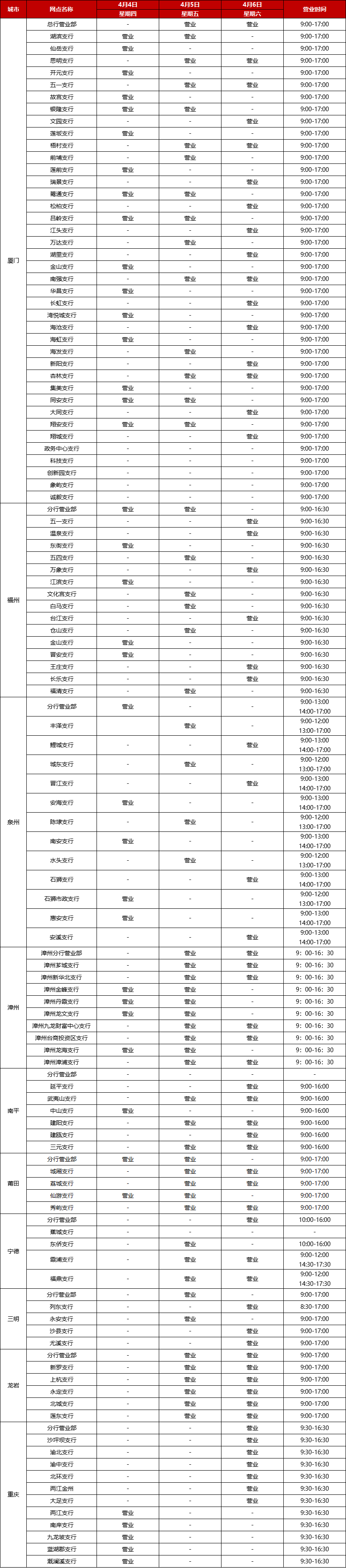 廈門銀行2024年清明節(jié)假期網(wǎng)點對外營業(yè)時間通告