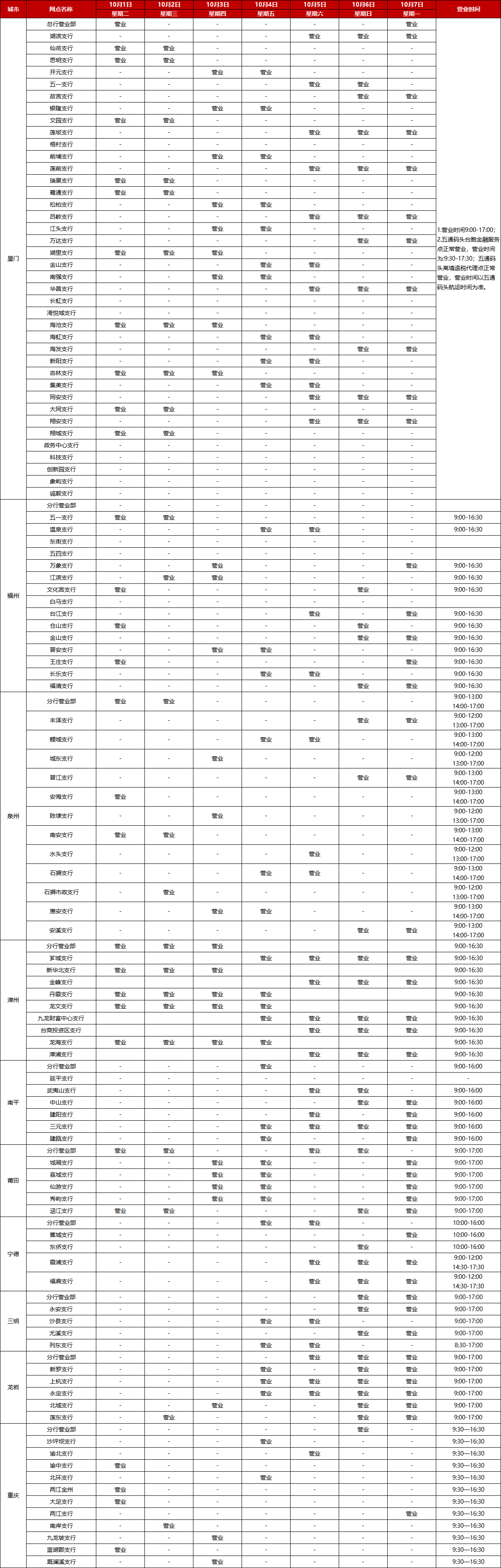 廈門銀行2024年國慶節(jié)假期網(wǎng)點(diǎn)對(duì)外營業(yè)時(shí)間通告