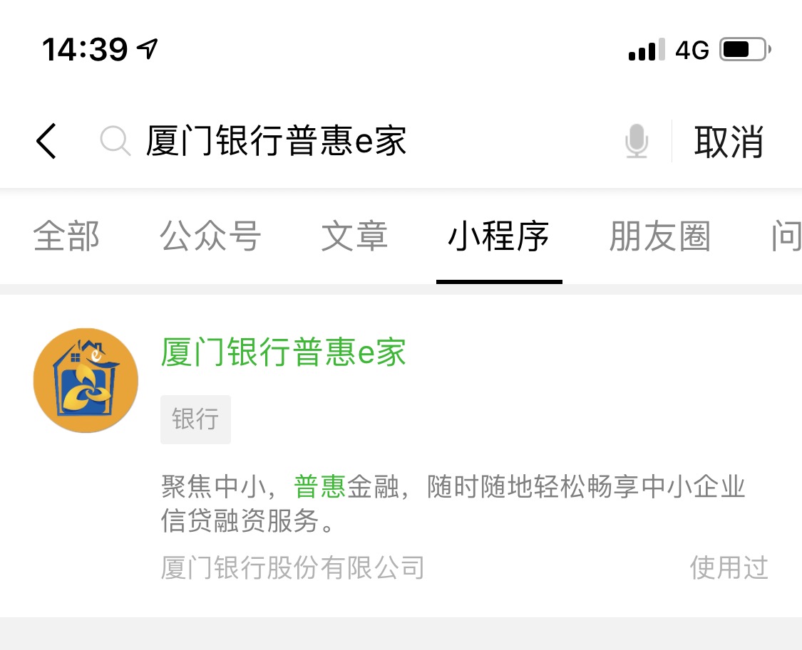 1.通過(guò)手機(jī)登陸微信,搜索【廈門銀行普惠e家】小程序,點(diǎn)擊進(jìn)入。