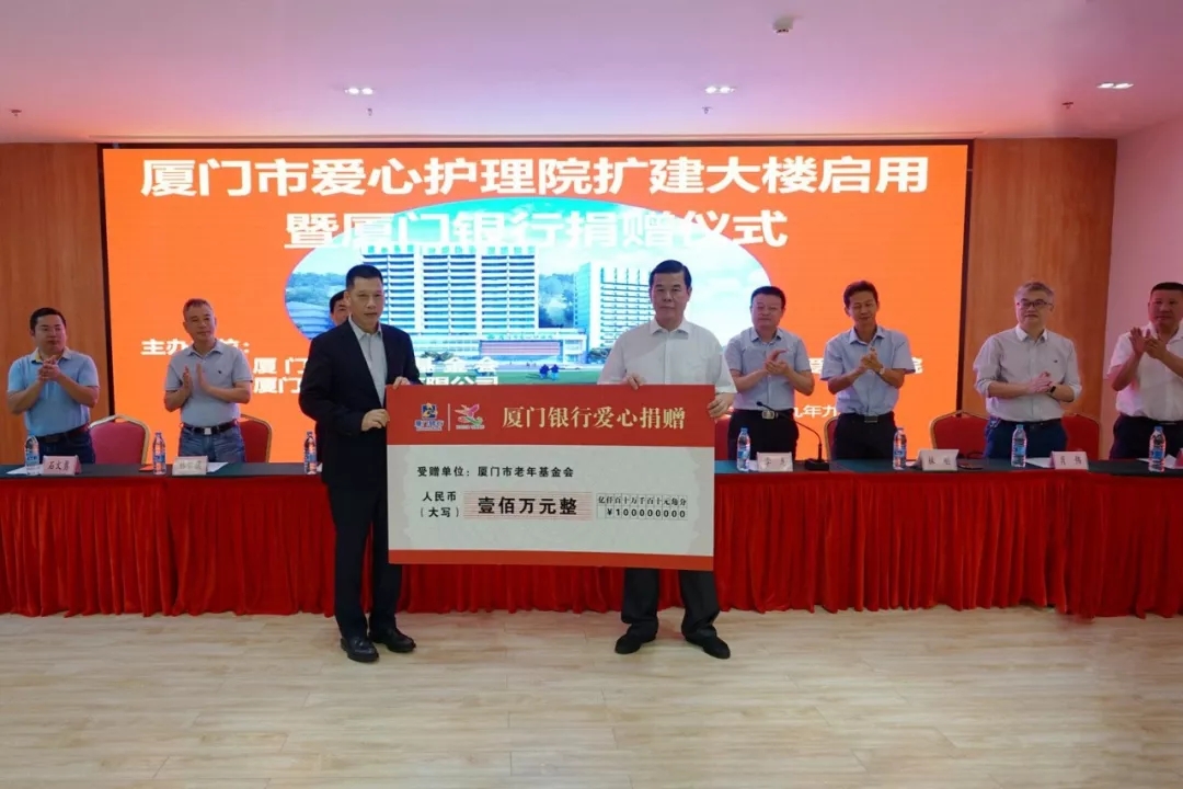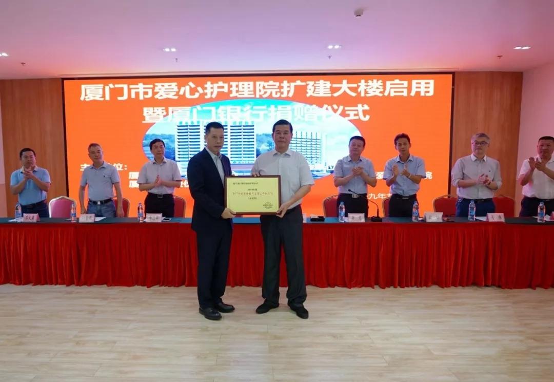 2019年10月16日,廈門市愛心護(hù)理院擴(kuò)建大樓啟用暨廈門銀行捐贈(zèng)儀式溫馨舉辦,廈門銀行再度為“廈門銀行特困老人救助基金”捐贈(zèng)100萬元。老年基金會(huì)代會(huì)長李建福向廈門銀行吳世群董事長授予“2019年度廈門市發(fā)展老年慈善事業(yè)貢獻(xiàn)單位(金質(zhì)獎(jiǎng))”牌匾。
