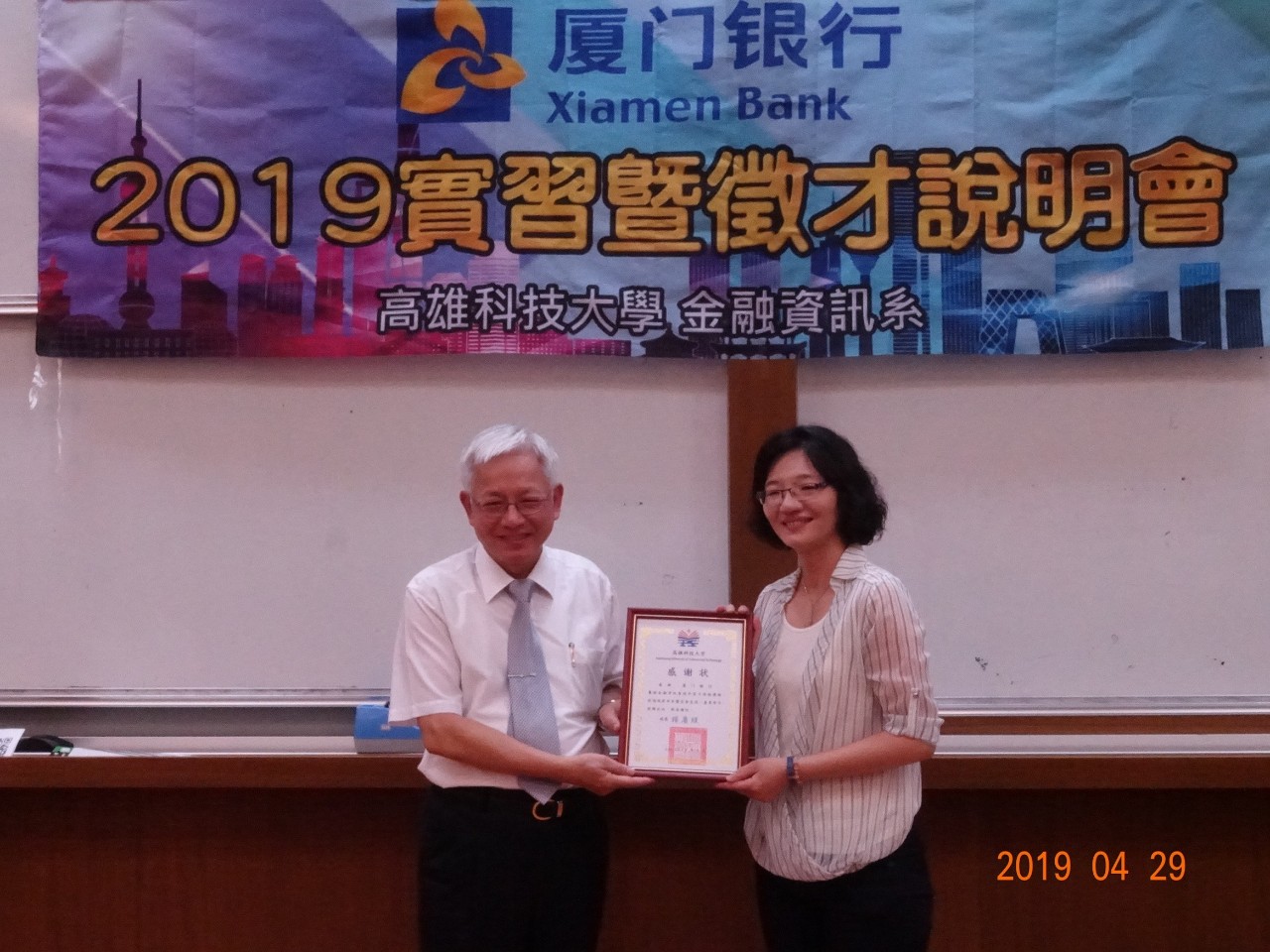高雄科技大學金融信息系主任張嘉倩(右)向廈門銀行頒發(fā)“感謝狀”