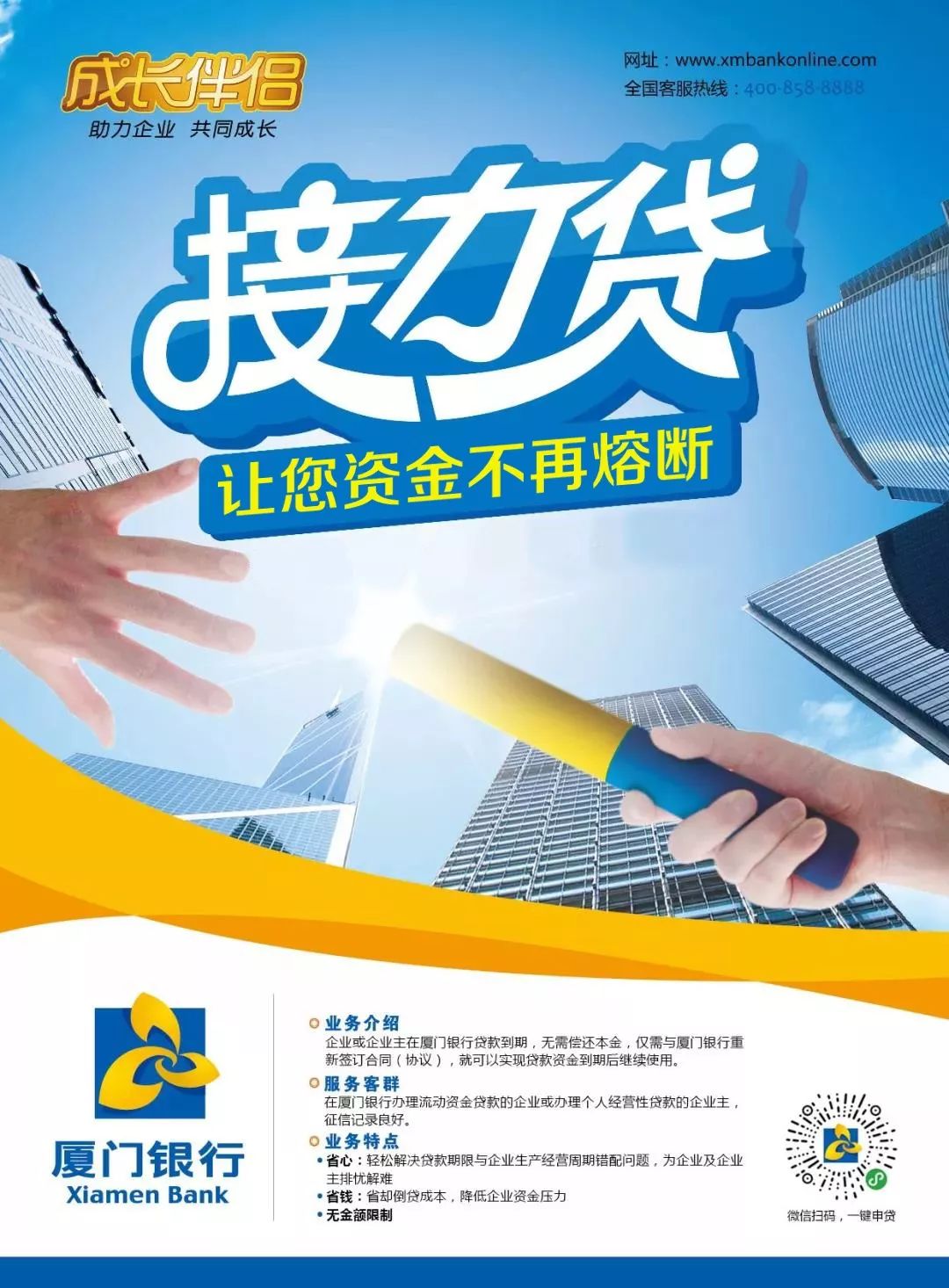 “接力貸”是廈門銀行在廈門銀保監(jiān)局的指導與支持下,秉持“完善和創(chuàng)新小微企業(yè)貸款服務,提高小微企業(yè)金融服務水平”的宗旨推出的無縫續(xù)貸產品。