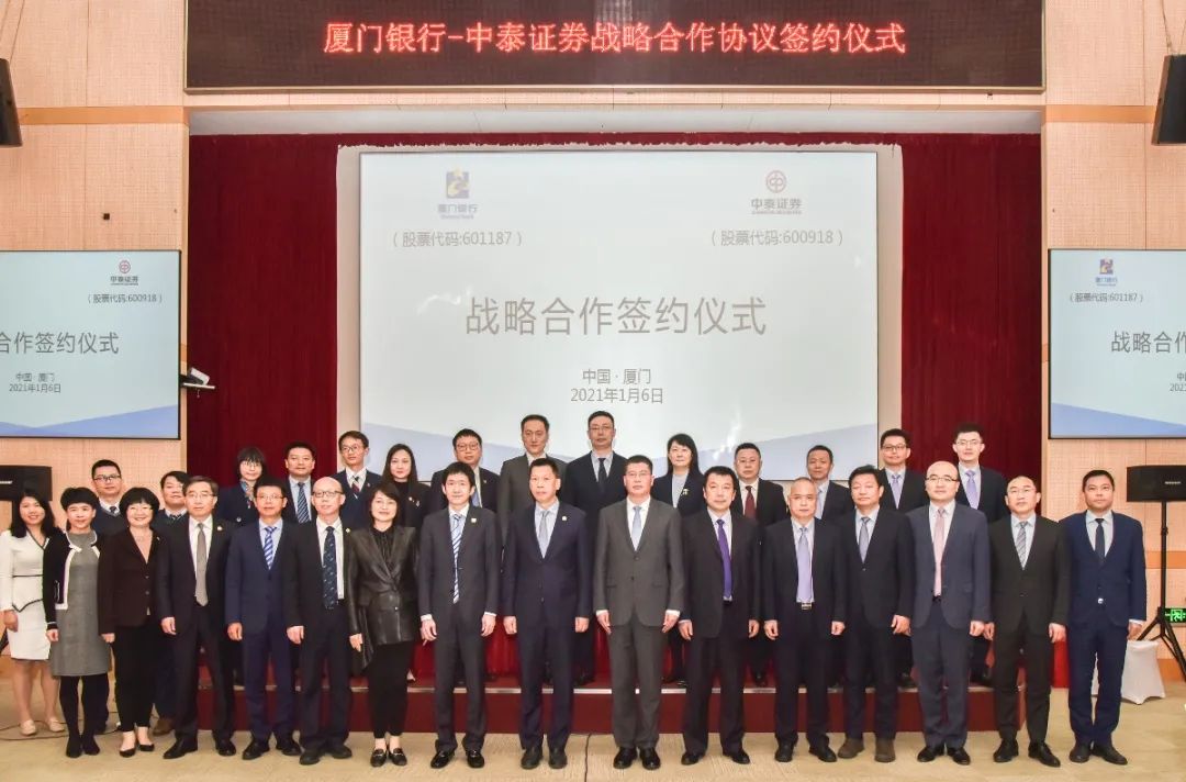 2021年1月6日,在廈門銀行黨委書記、董事長吳世群與中泰證券黨委書記、董事長李峰等雙方領(lǐng)導(dǎo)共同見證下,廈門銀行與中泰證券在廈門共同簽署戰(zhàn)略合作協(xié)議。