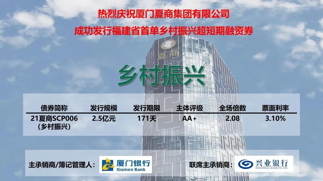 廈門銀行牽頭主承銷的福建省首單鄉(xiāng)村振興超短期融資券、廈門市首單鄉(xiāng)村振興債務(wù)融資工具——廈門夏商集團(tuán)有限公司2021年度第六期超短期融資券(鄉(xiāng)村振興),于2021年5月7日成功發(fā)行。本筆債券發(fā)行規(guī)模2.5億元,期限171天發(fā)行利率僅3.10%,受到了投資人的青睞和發(fā)行人的好評(píng)。