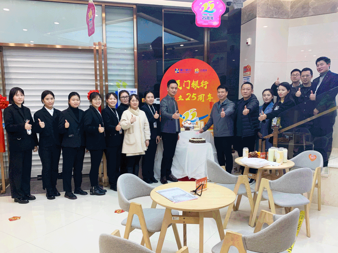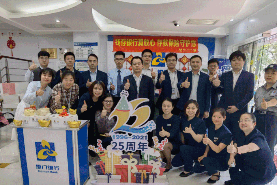 廈門、福州、莆田等地區(qū)的各營業(yè)網點舉辦了各具創(chuàng)意的慶?;顒印S械难埧蛻粢黄鹎械案?、吹蠟燭;有的布置了“happybirthday”字樣的氣球;有的用玫瑰花裝飾出“25”字樣,并邀請客戶、員工一起分享生日蛋糕,傳遞生日喜悅……全體員工還收到了精心準備的小蛋糕,甜蜜與幸福洋溢在每位員工的笑臉上。大家為廈門銀行送上祝福,祝愿廈門銀行風華正茂新征程,青春有為譜新篇。