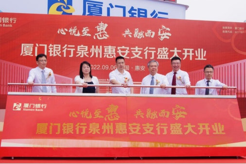 2022年9月6日,廈門銀行泉州惠安支行正式開業(yè),成為廈門銀行在泉州地區(qū)的第9家支行,將為惠安經(jīng)濟社會發(fā)展提供更加優(yōu)質(zhì)便捷的金融服務(wù)。開業(yè)當日,廈門銀行行長吳昕灝,惠安縣縣長莊稼祥、惠安縣螺城鎮(zhèn)鎮(zhèn)長蔡明霞、縣直有關(guān)部門、縣屬國有企業(yè)主要負責人,泉州分行行長洪堯文、泉州分行黨委書記林志宏等領(lǐng)導出席開業(yè)典禮。