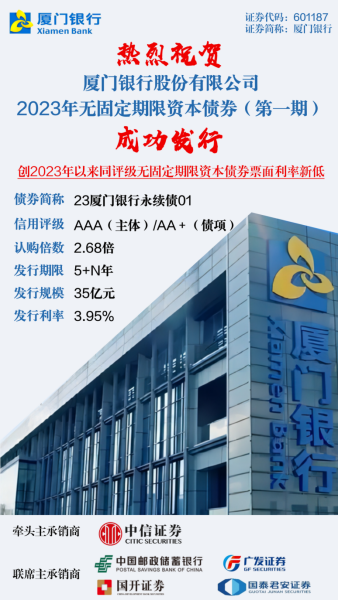 2023年7月13日,廈門銀行成功發(fā)行了35億元“2023年廈門銀行股份有限公司無固定期限資本債券(第一期)”,全場認(rèn)購倍數(shù)2.68,票面利率3.95%。