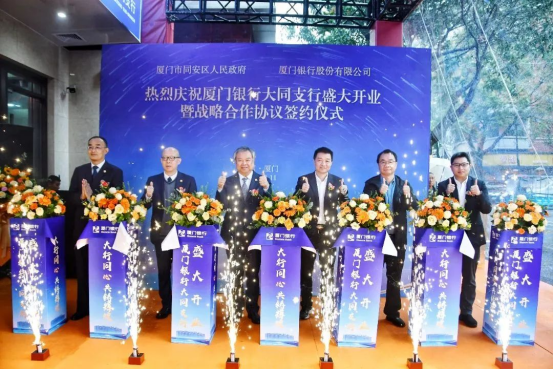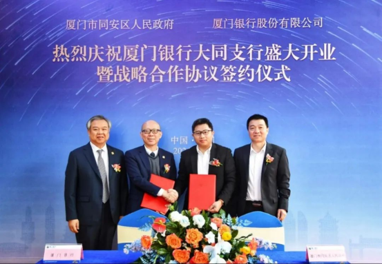 2024年3月11日,廈門(mén)銀行大同支行對(duì)外揭牌開(kāi)業(yè)。開(kāi)業(yè)儀式上,廈門(mén)銀行與廈門(mén)市同安區(qū)人民政府簽署戰(zhàn)略合作協(xié)議。廈門(mén)市同安區(qū)人民政府常務(wù)副區(qū)長(zhǎng)李祖光、廈門(mén)市同安區(qū)財(cái)政局局長(zhǎng)林曉龍、廈門(mén)市同安區(qū)工業(yè)與信息化局局長(zhǎng)徐火祥、廈門(mén)市同安區(qū)建設(shè)與交通局局長(zhǎng)葉國(guó)生、廈門(mén)市同安區(qū)人力資源與社會(huì)保障局局長(zhǎng)梁永忠、廈門(mén)銀行行長(zhǎng)吳昕顥、副行長(zhǎng)兼廈門(mén)銀行廈門(mén)業(yè)務(wù)管理總部總監(jiān)莊海波等出席簽約儀式。