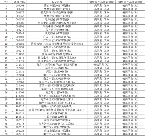 根據(jù)《證券期貨投資者適當(dāng)性管理辦法(2022年修正)》(中國(guó)證券監(jiān)督管理委員會(huì)令第202號(hào))、《基金募集機(jī)構(gòu)投資者適當(dāng)性管理實(shí)施指引(試行)》(中基協(xié)發(fā)〔2017〕4號(hào))等規(guī)定要求,為切實(shí)履行適當(dāng)性義務(wù),保護(hù)投資者的合法權(quán)益,我行參考第三方評(píng)級(jí)機(jī)構(gòu)及同業(yè)評(píng)級(jí),并結(jié)合產(chǎn)品類型、風(fēng)險(xiǎn)收益特征,于2025年3月25日調(diào)整了部分代銷公募基金產(chǎn)品的風(fēng)險(xiǎn)等級(jí),調(diào)整后客戶風(fēng)險(xiǎn)承受能力評(píng)估等級(jí)可能存在與產(chǎn)品風(fēng)險(xiǎn)等級(jí)不匹配的情況,請(qǐng)您及時(shí)關(guān)注。