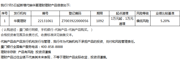 廈門銀行7月5日代銷華夏理財(cái)理財(cái)產(chǎn)品信息