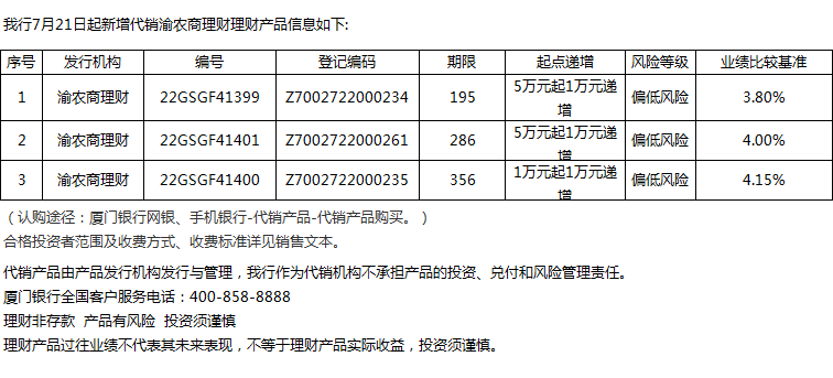 廈門銀行7月21日代銷渝農(nóng)商理財理財產(chǎn)品信息
