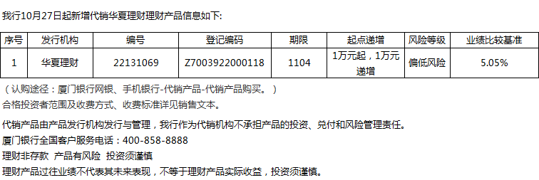 廈門銀行10月27日代銷華夏理財(cái)理財(cái)產(chǎn)品信息
