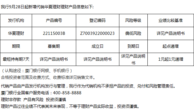 廈門銀行9月28日代銷華夏理財理財產(chǎn)品信息