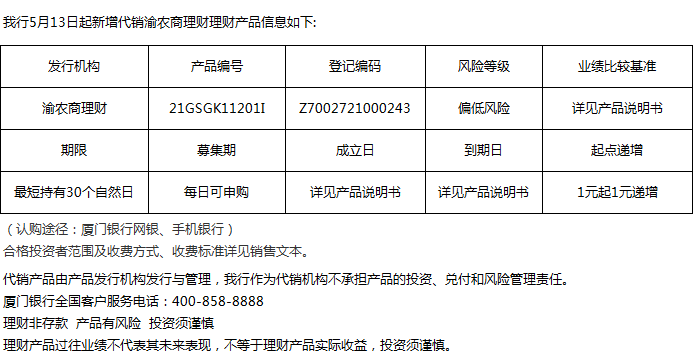 廈門銀行5月13日代銷渝農(nóng)商理財理財產(chǎn)品信息