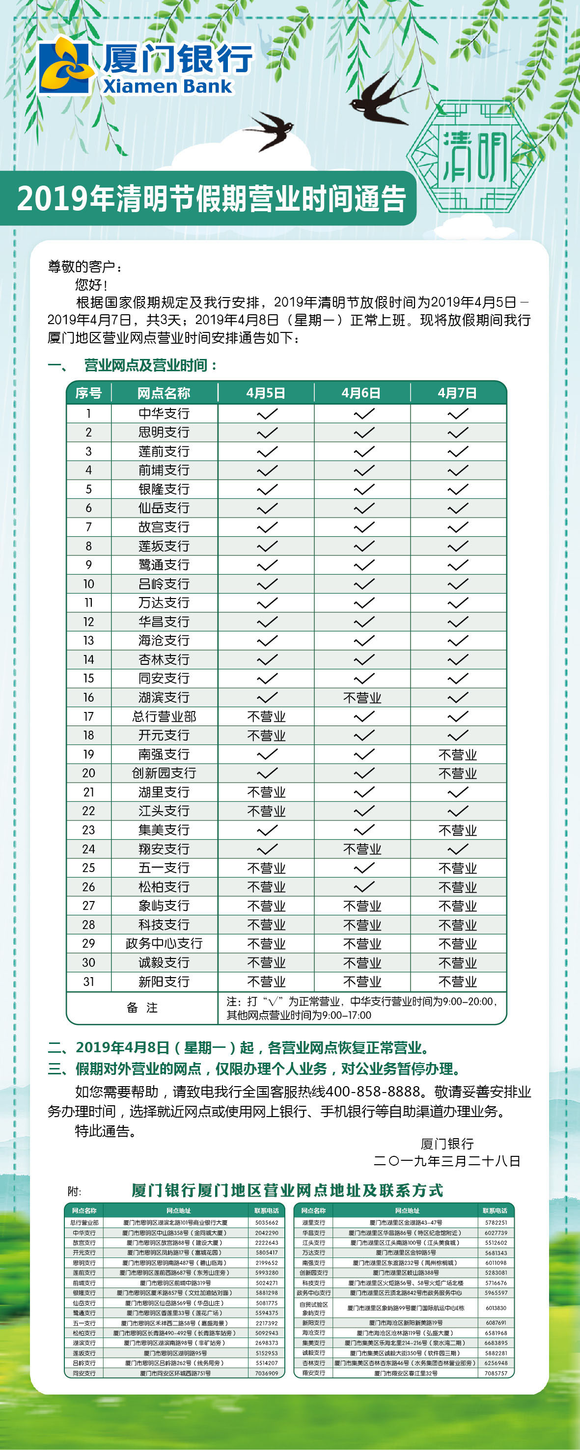 2019年廈門銀行廈門地區(qū)清明假期各網(wǎng)點(diǎn)營業(yè)時(shí)間