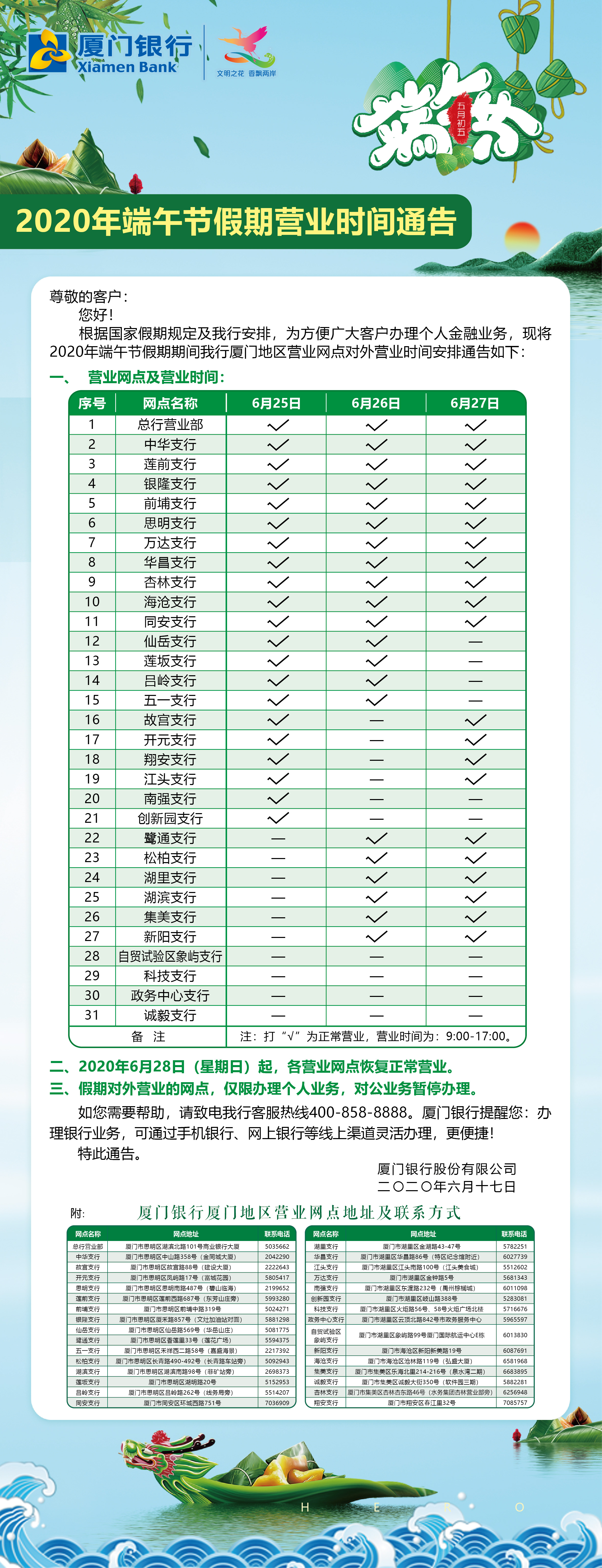 廈門銀行廈門地區(qū)營業(yè)網(wǎng)點2020年端午節(jié)假期營業(yè)時間通告