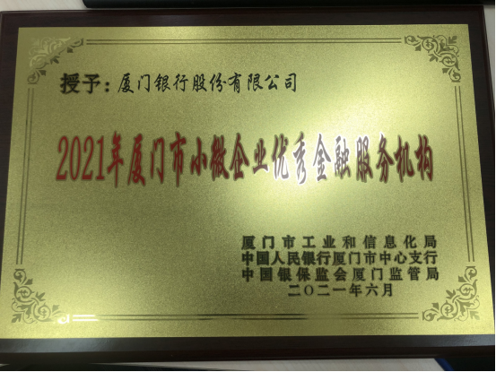 6月1日,在2021年廈門市中小企業(yè)服務(wù)月活動啟動儀式上,我行榮獲 “2021年廈門市銀行業(yè)金融機構(gòu)服務(wù)小微企業(yè)優(yōu)秀機構(gòu)”榮譽稱號。該獎項由廈門市工業(yè)和信息化局、中國人民銀行廈門市中心支行、中國銀保監(jiān)會廈門監(jiān)管局聯(lián)合評選。