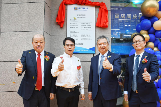 廈門銀行行長吳昕顥、前埔支行行長謝建平和廈門市思明區(qū)政協(xié)副主席許建民、富貴鳥(廈門)科技集團(tuán)有限公司董事長洪頂超共同為支行開業(yè)揭牌