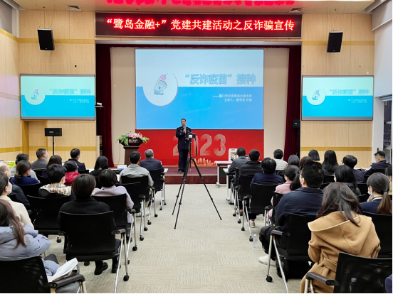 自廈門銀行廈門業(yè)務(wù)管理總部黨委“鷺島金融+”黨建品牌發(fā)布以來,我們積極構(gòu)建“鷺島金融+近鄰朋友圈”,與共建單位加強(qiáng)黨建資源共享、黨員隊伍共育和精神文明共創(chuàng)。2023年2月16日,廈門銀行廈門業(yè)務(wù)管理總部黨委邀請黨建共建單位廈門市公安局濱北派出所開展“反詐疫苗”接種主題宣講,通過“黨建引領(lǐng)聚合力 警銀協(xié)作穩(wěn)安全”反詐宣傳培訓(xùn),以黨建引領(lǐng)促業(yè)務(wù)發(fā)展。