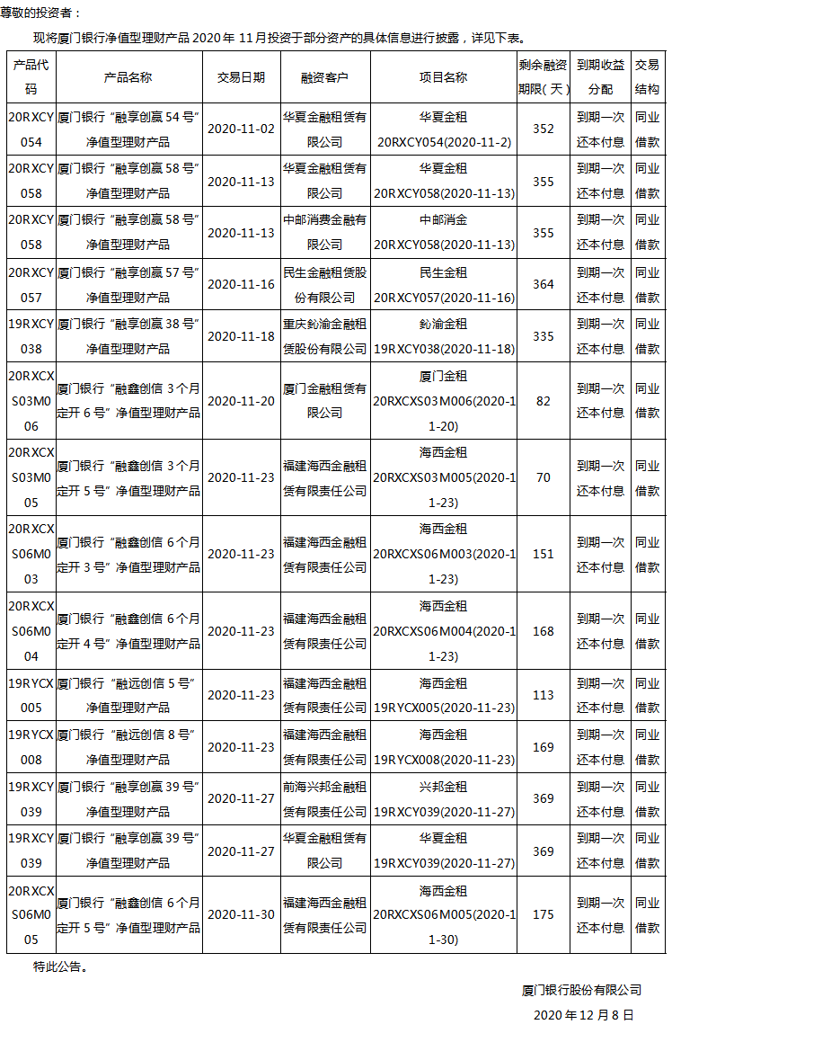 關(guān)于廈門銀行凈值型理財(cái)產(chǎn)品2020年11月投資部分資產(chǎn)的公告
