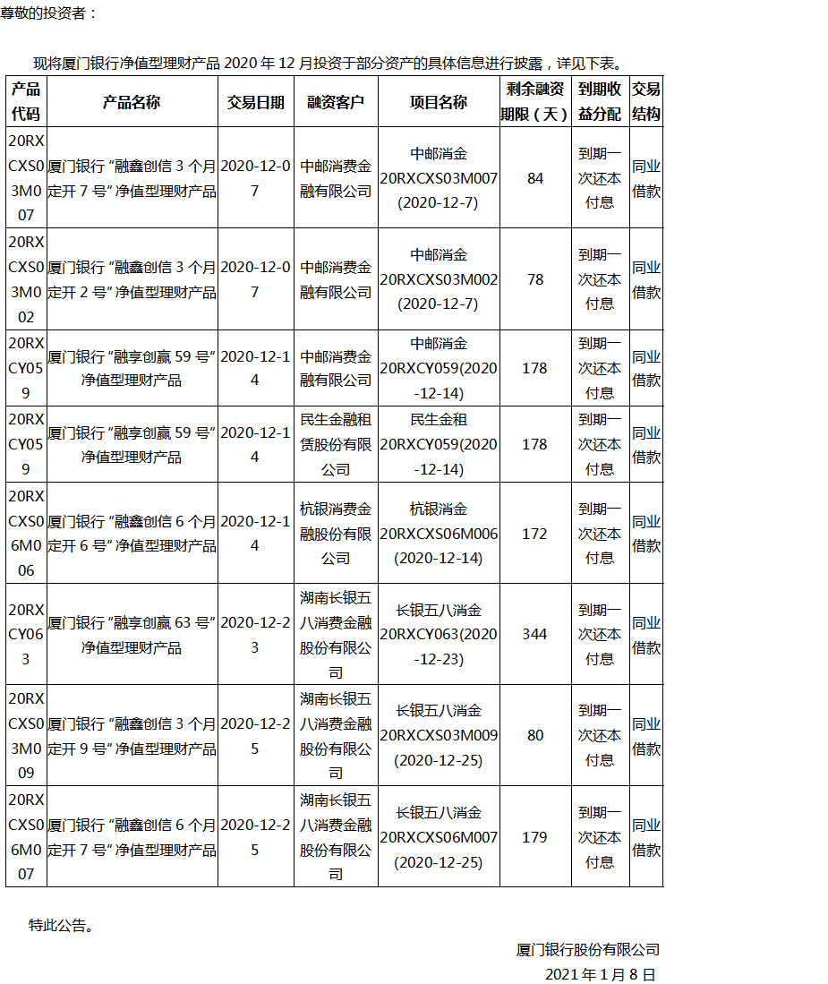 關于廈門銀行凈值型理財產(chǎn)品2020年12月投資部分資產(chǎn)的公告