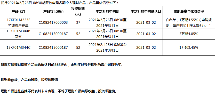 “鳳凰花”理財(cái)產(chǎn)品2021年2月26日發(fā)售信息