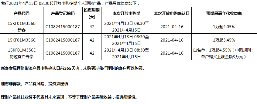 “鳳凰花”理財(cái)產(chǎn)品2021年4月13日發(fā)售信息