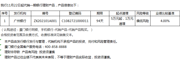 廈門銀行11月22日代銷廣州銀行理財(cái)產(chǎn)品信息