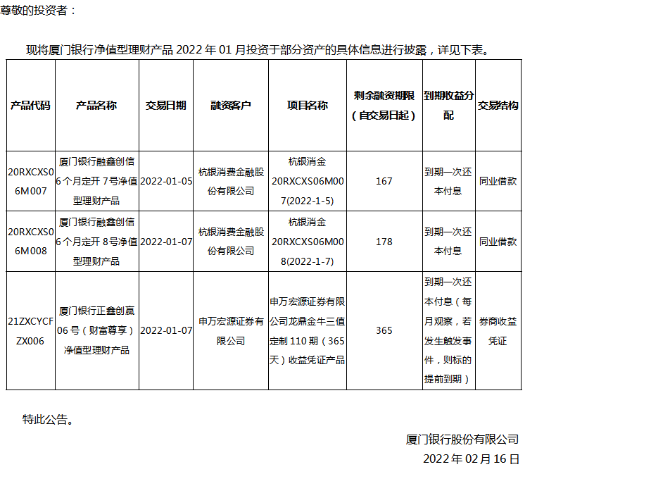 關于廈門銀行凈值型理財產(chǎn)品2022年01月投資部分資產(chǎn)的公告