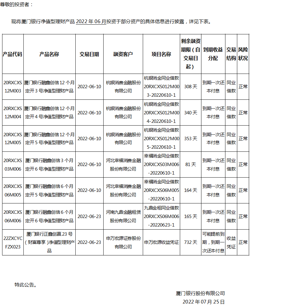 關于廈門銀行凈值型理財產(chǎn)品2022年06月投資部分資產(chǎn)的公告