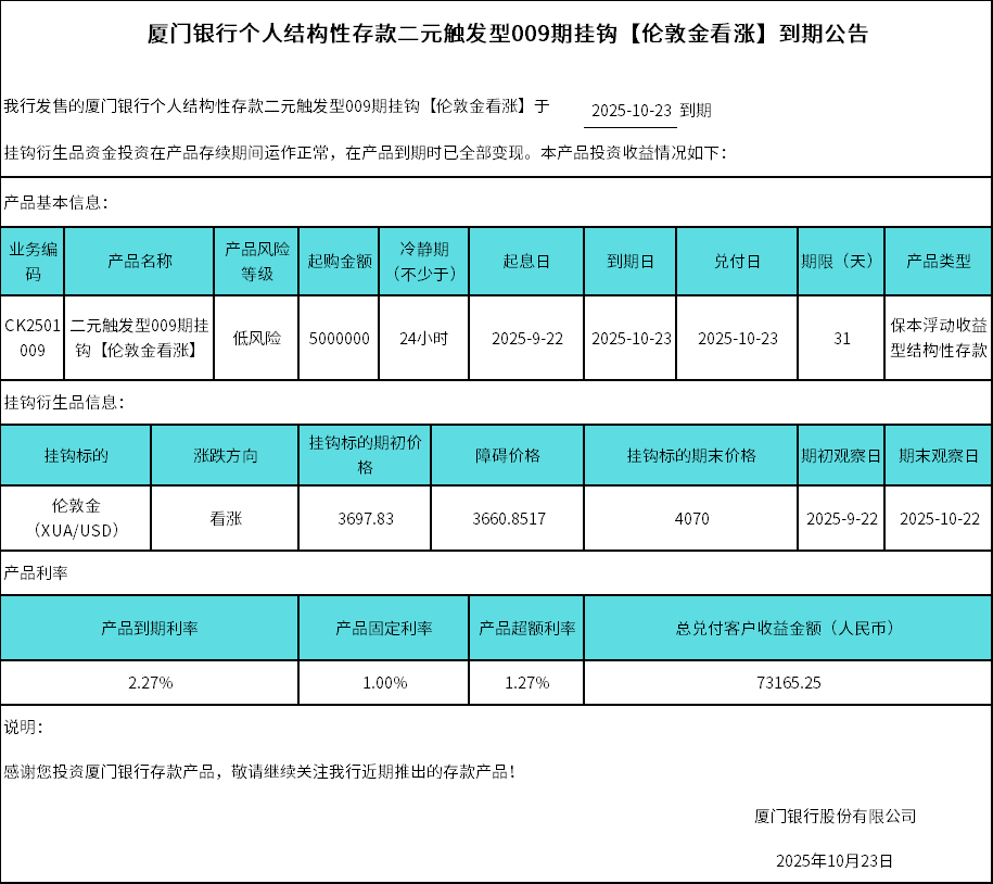 廈門銀行個人結(jié)構(gòu)性存款二元觸發(fā)型009期掛鉤【倫敦金看漲】到期公告