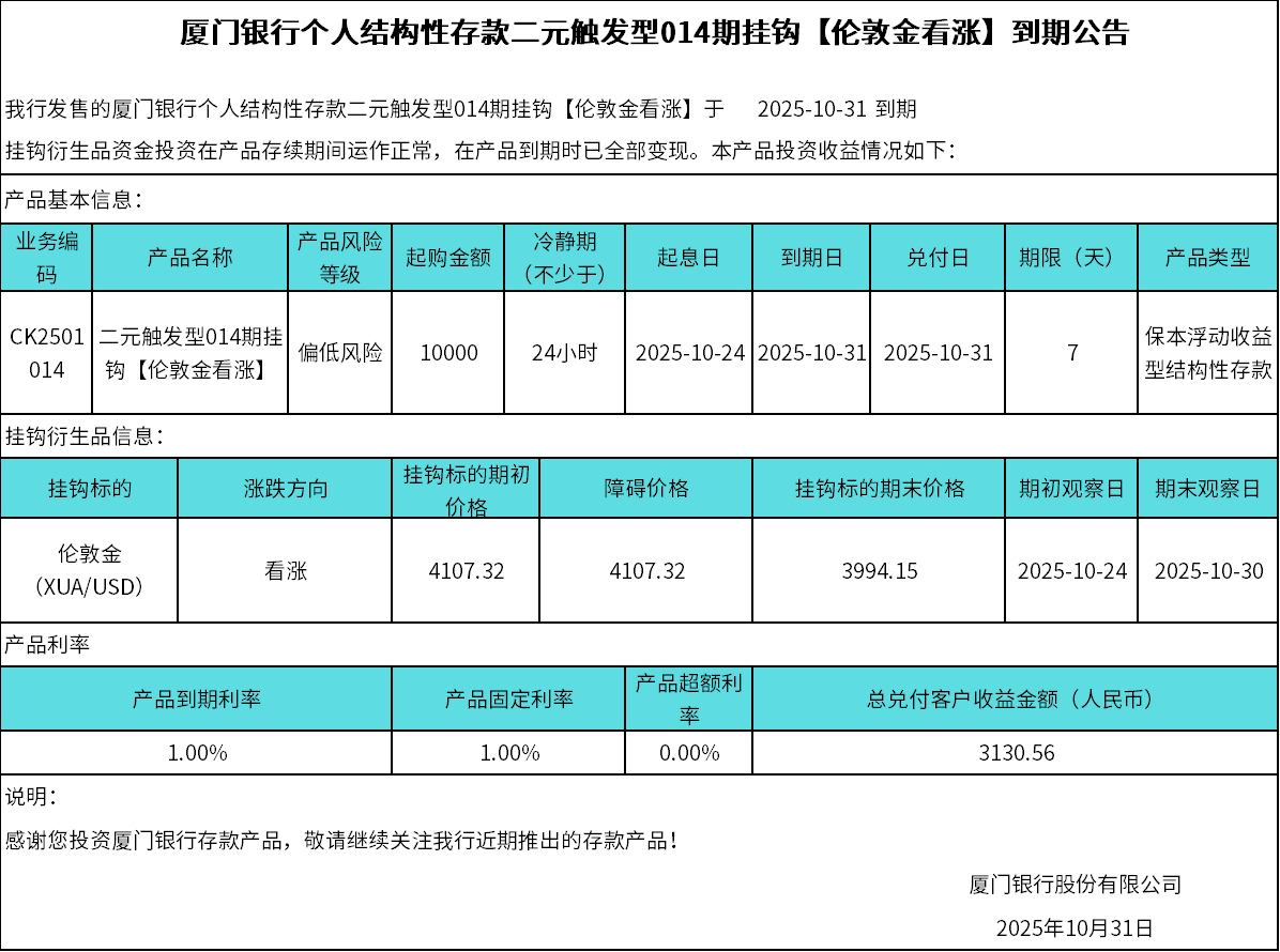 廈門銀行個人結(jié)構(gòu)性存款二元觸發(fā)型014期掛鉤【倫敦金看漲】到期公告