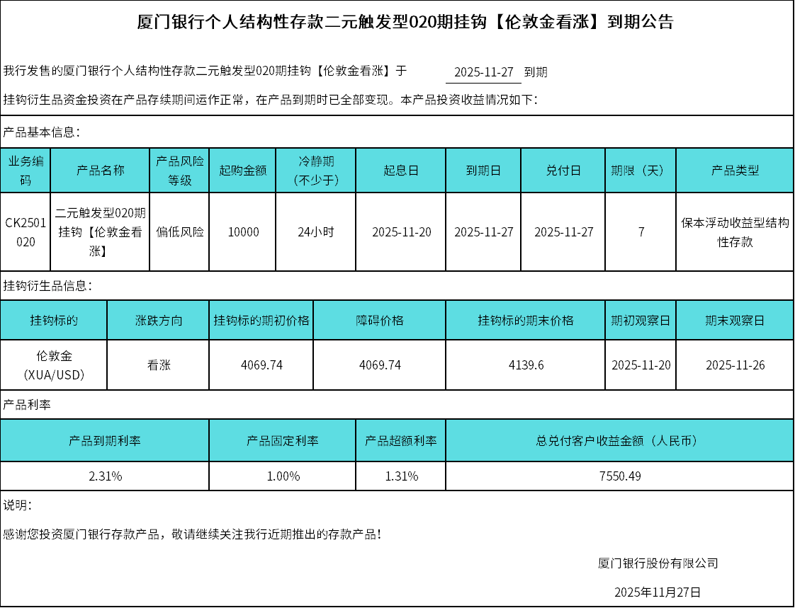 廈門銀行個人結構存款二元觸發(fā)型020期掛鉤【倫敦金看漲】到期公告