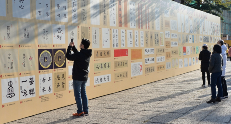 在南普陀寺廣場(chǎng)上,430幅來(lái)自廈門(mén)佛教界、市書(shū)法家協(xié)會(huì )、省以上書(shū)畫(huà)藝術(shù)家以及全國大德名家的作品,在廣場(chǎng)的巨幅展布上錯落有致地陳列著(zhù),其中書(shū)法作品339幅,美術(shù)作品91幅,氣勢恢宏,引得市民游客紛紛駐足觀(guān)賞。當天的書(shū)畫(huà)義賣(mài)環(huán)節,有慕名而來(lái)的香客,有不期而遇的游客,大家慷慨解囊,紛紛獻出自己的一份愛(ài)心。